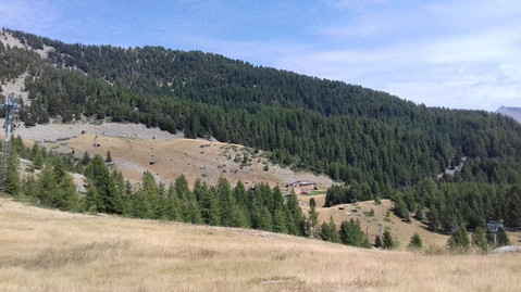 le chemin est large mais ils doivent stocker les cailloux dans le coin, je sais pas où placer mes roues et cela monte. Plus je m'élève plus cela monte et plus il y a de pierres. Arrivé à 2130 m un replat, une descente puis pour finir sur le col bas 2113 m un chemin herbeux descendant, et oui si il se nomme col bas ce n'est pas pour rien. Si vous vous souvenez un col est un point bas entre deux points hauts, c'est pour cela que les lignes de crêtes sont pas faciles, on monte on descend au col et on remonte ainsi de suite. 13 km 1430 m D+ le gars qui a tracé soit il est très costaud soit il vient pas sur place !!! Petite photo au col sur une borne militaire, près du fort de Dormillouse, il y a pas de signalétique au sommet. !